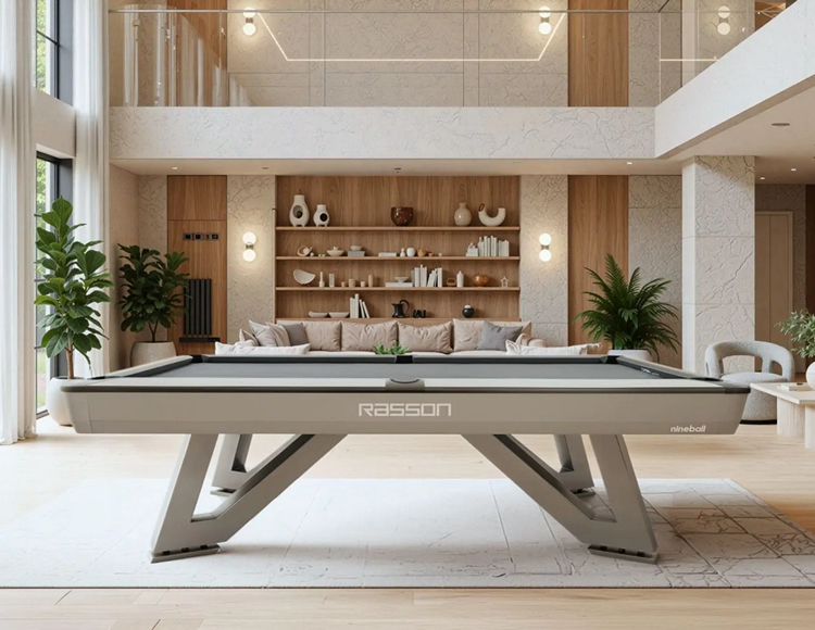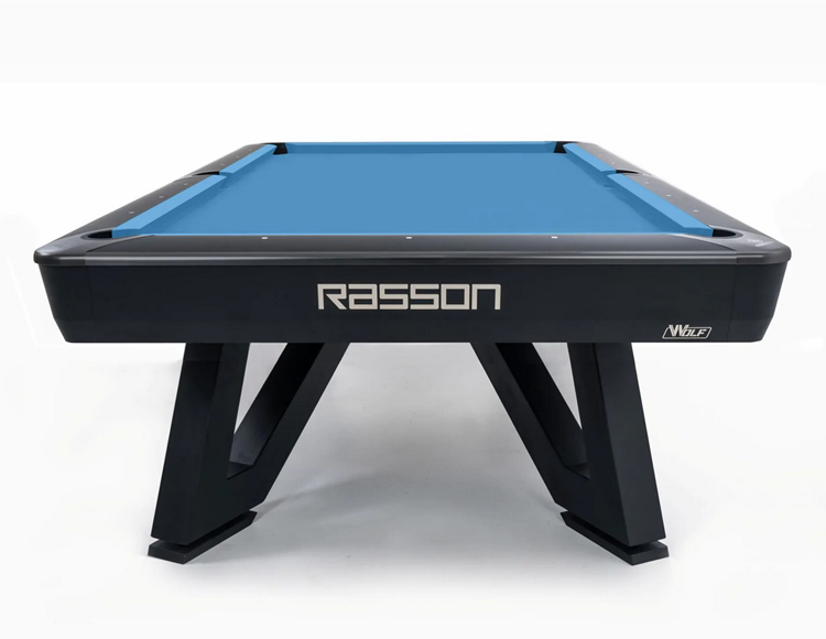 The Rasson Wolf pool table features a bold, modern design inspired by the letter "W" paying tribute to its name. Its signature leg structure embodies the "W" shape from various angles, combining minimalist aesthetics with structural strength. True to Rasson's design philosophy of simplicity without compromise, the Wolf achieves an impressive balance of elegance, stability, and practicality.